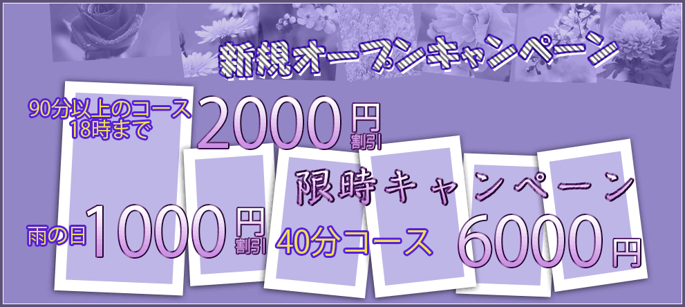 当店では、アロマオイルの効能と当店自慢のセラピストによるリンパマッサージの相乗効果による、癒しのひとときをお客様お一人お一人にお届けしております、自然で心やすらぐ優美な香りを、施術中はもちろんご帰宅お休みになってから翌日朝目覚めでまで楽しんで頂けます、どうぞゆっくりご堪能ください。